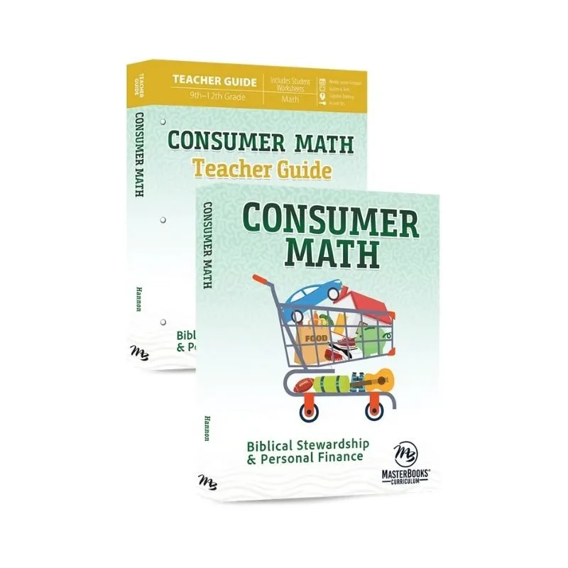Consumer Math homeschool curriculum set equips teens in grades 9–12 to apply math skills to budgeting, saving, debt, taxes, housing, and career planning—developing financial literacy rooted in faith and practical life application.