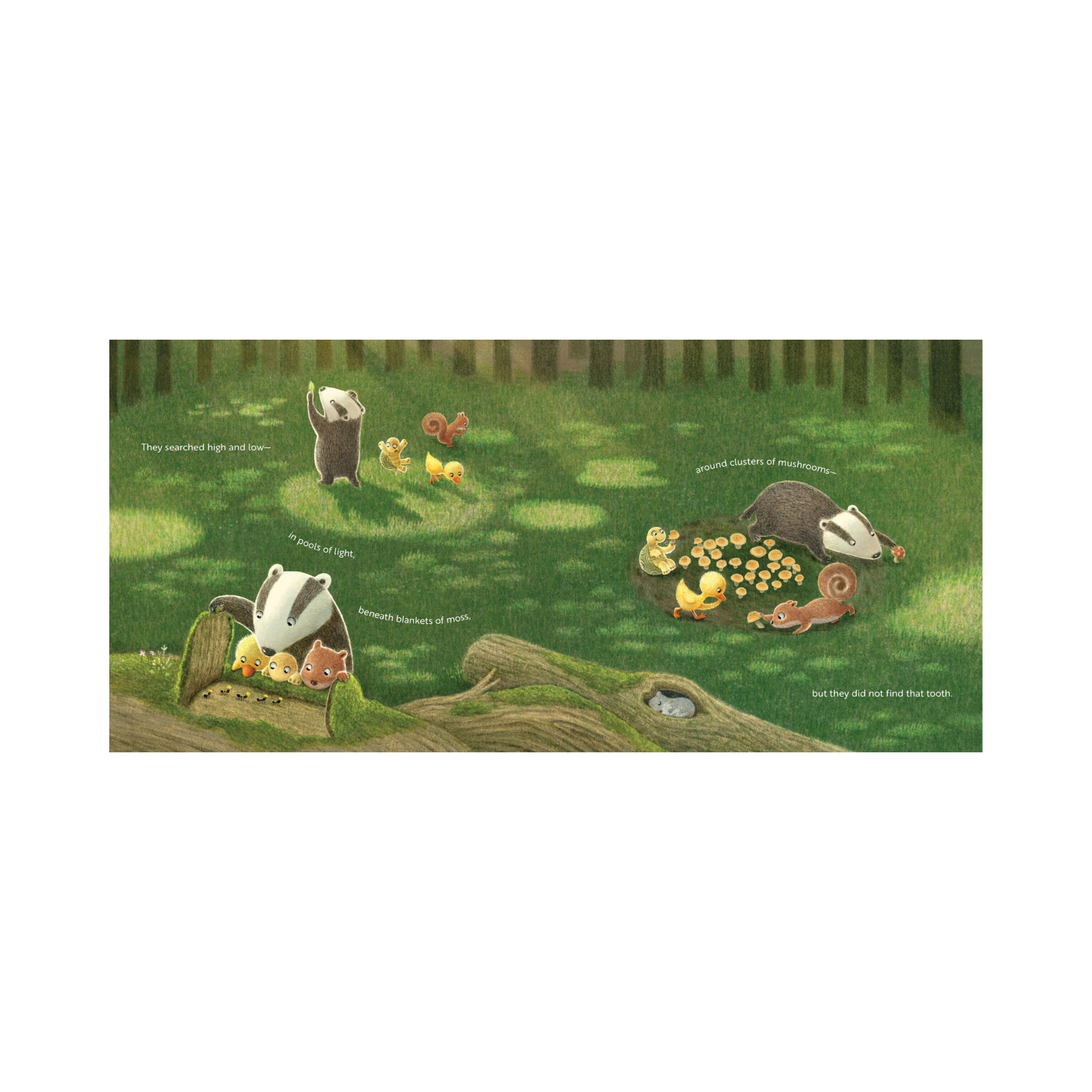 Duck sets out to find that tooth—it’s a good-friend thing to do, after all. Along the way, he enlists help from Badger, Turtle, Squirrel, and Mouse.