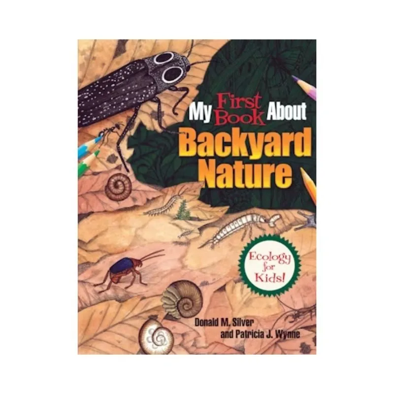 Realistic pictures to color depict the backyard through all four seasons and during the day and night. The captions identify different types of trees, flowers, and bushes; butterflies, moths, and birds; reptiles and amphibians; and many other plants and animals.