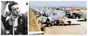 Capt. Joseph McConnell is pictured here in a photo from May 18, 1953, taken at Suwon Air Base, the day he shot down his three last MiGs on his final day in combat. In the photo to the right, F-86F Sabre fighter jets from the 51st Fighter Interceptor Wing Checkertails, with which he was a Flight Leader, are readied for combat during the Korean War at Suwon Air Base.